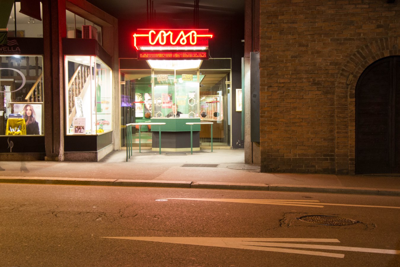 Erano gli anni 70. Jvana Grimaldi ci racconta l’aneddoto mentre è seduta sul divanetto geometrico della hall del Cinema Corso a Lugano. Ogni tanto si alza, si muove tra i vetri che riflettono le luci in diagonale, tra i forti colori verde-arancio del salone di attesa, e il vano biglietteria, piccolo, caldo, dove dispone tutte le sue carte. La prima proiezione è prevista fra 30 minuti, lei verifica che ogni cosa stia al suo posto. Nella sala grande, quella in bianco e nero, ideata e disposta non a caso dall’architetto Rino Tami per garantire la migliore percezione dell’immagine cinematografica sullo schermo, la signora Jvana entrerà qualche minuto prima della proiezione. “Il cinema nasce nel 1956. Io arrivo qui nel 1974. Da allora per me si è aperto un mondo”. In biglietteria da allora, Jvana gestisce l’organizzazione del cinema, una volta con lei c’erano le “maschere”, gli accompagnatori, “controllavo che tutto funzionasse, i manifesti, gli orari, la pubblicità”. Oggi passeggiando in via Pioda a Lugano, dopo le 18:00, la si scorge dietro il vetro della biglietteria, un corpo esterno al locale nel quale organizza biglietti, appunti, orari.